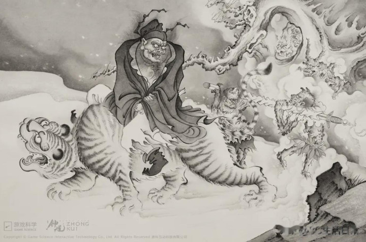 故事的转折点,来自美术总监杨奇的一次提案。 他回忆起一次聊天中提及“骑虎的钟馗”形象,翻阅古画资料时发现这种形象在明代画作中屡见不鲜,于是萌生了“把钟馗做成新主角”的念头。