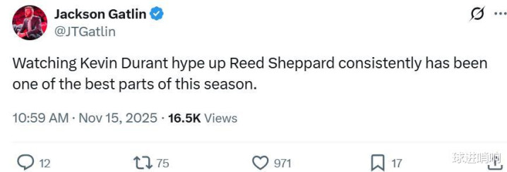 谢泼德的快速提升与杜兰特帮助其建立信心息息相关,杜兰特此前就曾公开表示,所有人都试图给谢泼德建议,但自己尽量不说他,而是多鼓励他。 本场比赛中依旧如此,杜兰特频频在谢泼德命中投篮后给予鼓励,火箭随队记者Jackson Gatlin发文到:“看着杜兰特不断鼓励谢泼德,已成为火箭队本赛季比赛的一大亮点。”