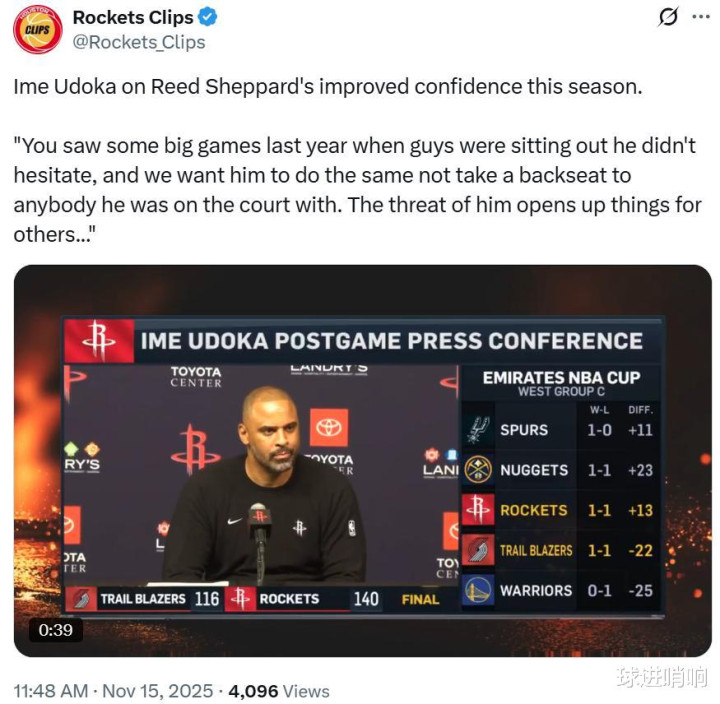 一向对年轻球员要求颇高的乌度卡也在赛后不禁公开夸赞谢泼德:“当他毫不犹豫时,他不输给任何对手,我们需要他这样的表现,不必屈居人后,他的进攻威胁能够为队友创造更多机会。”